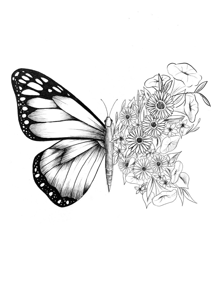 This mixed media butterfly piece was done for a friend's tattoo, with the butterfly and flowers symbolising change and growth.