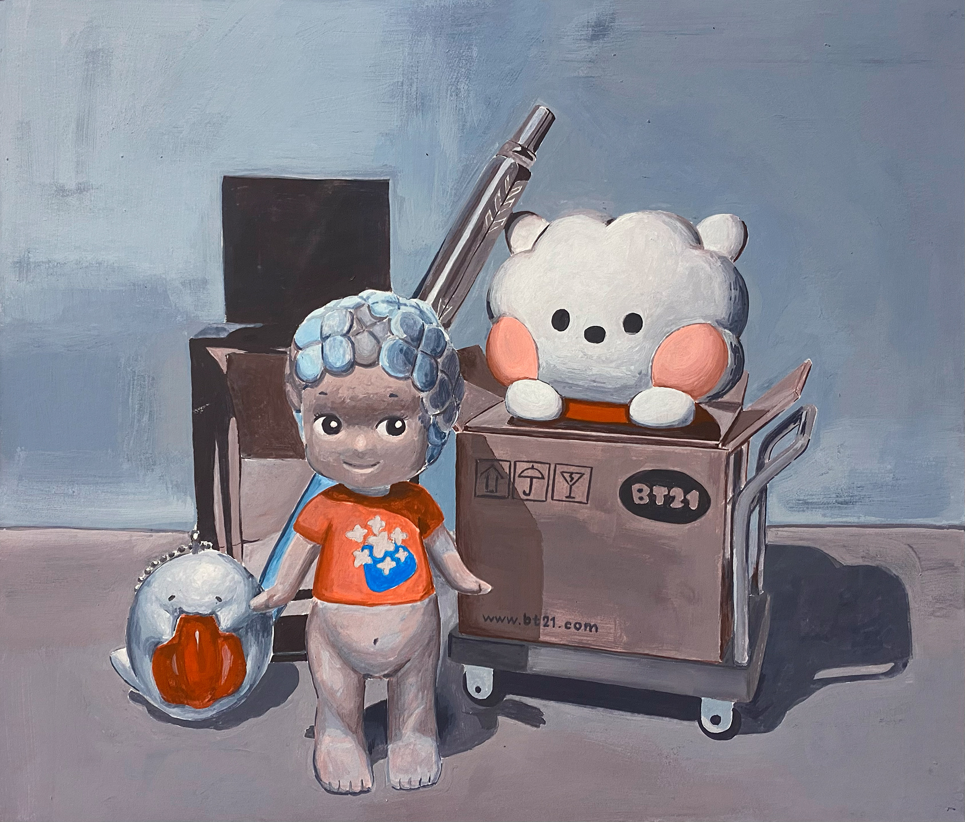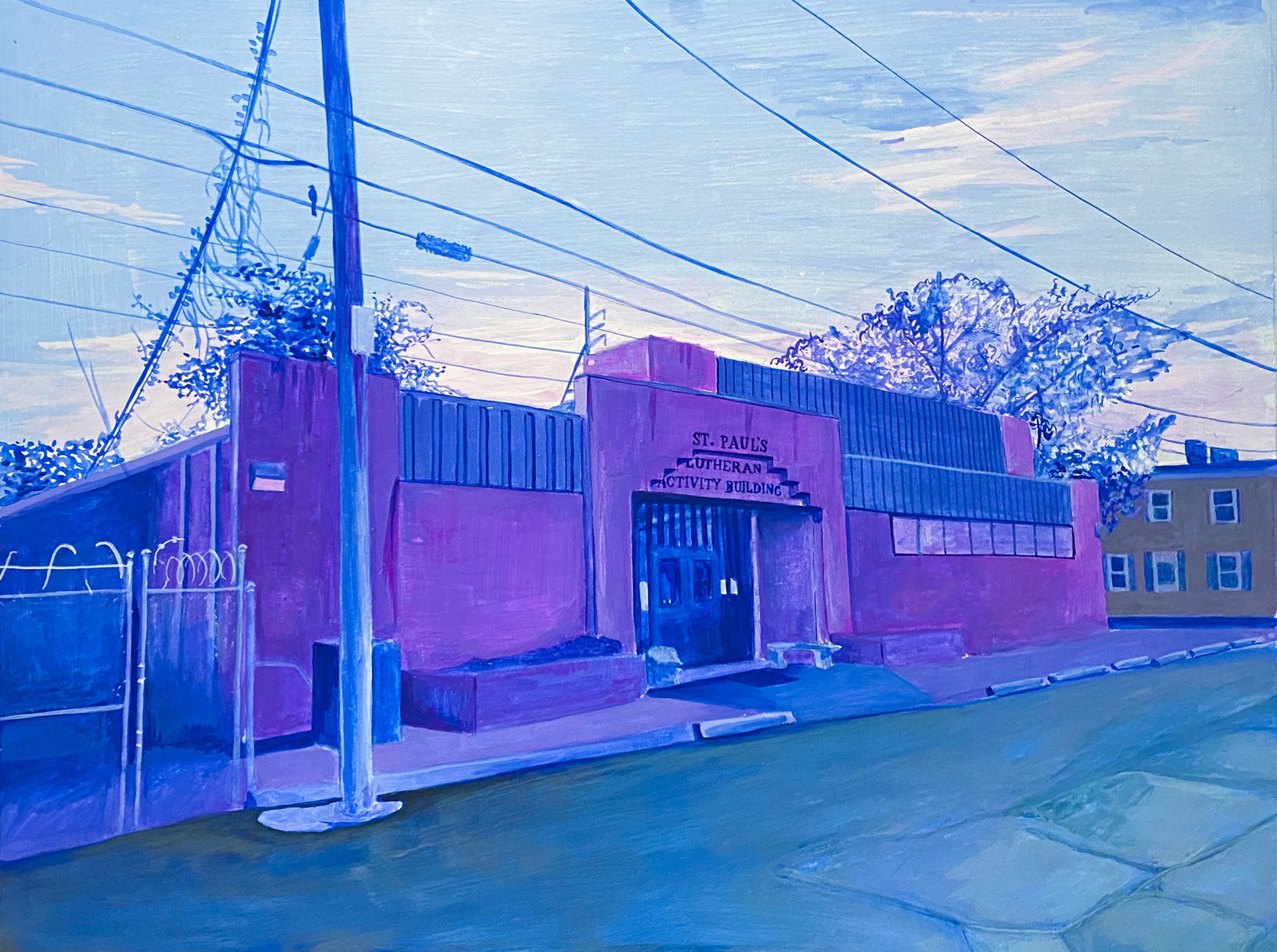 Each gouache painting is done with only two distinct colours and white gouache. Gouache on gessoed illustration board.