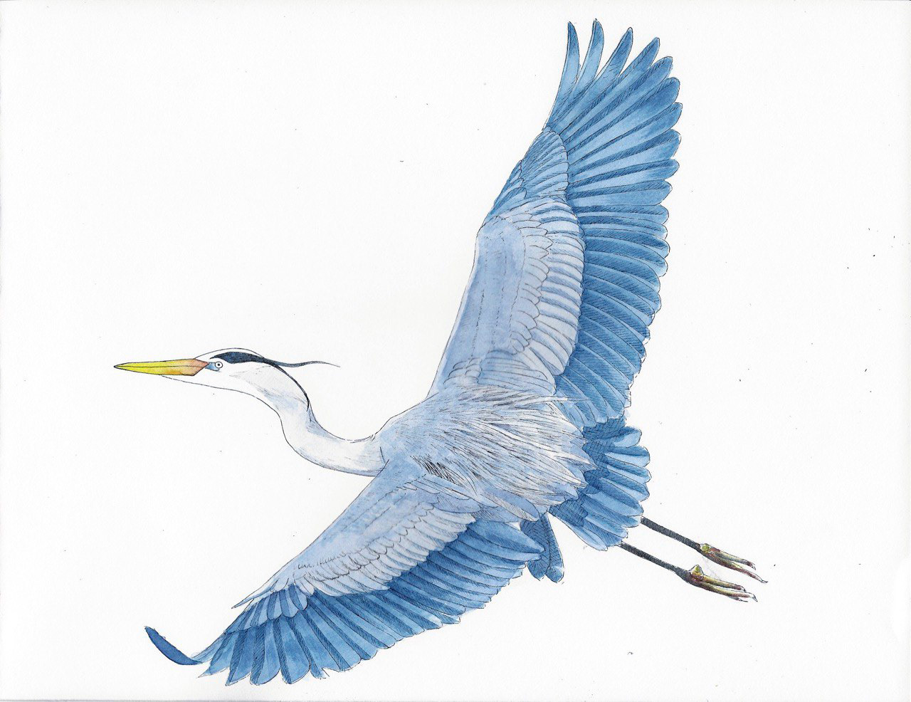 "Great Blue Heron" is a study rendering of a Great Blue Heron done in pen and watercolour as a means of exploration in understanding the movement of herons, which was essential for creating the work "Self-Thought"