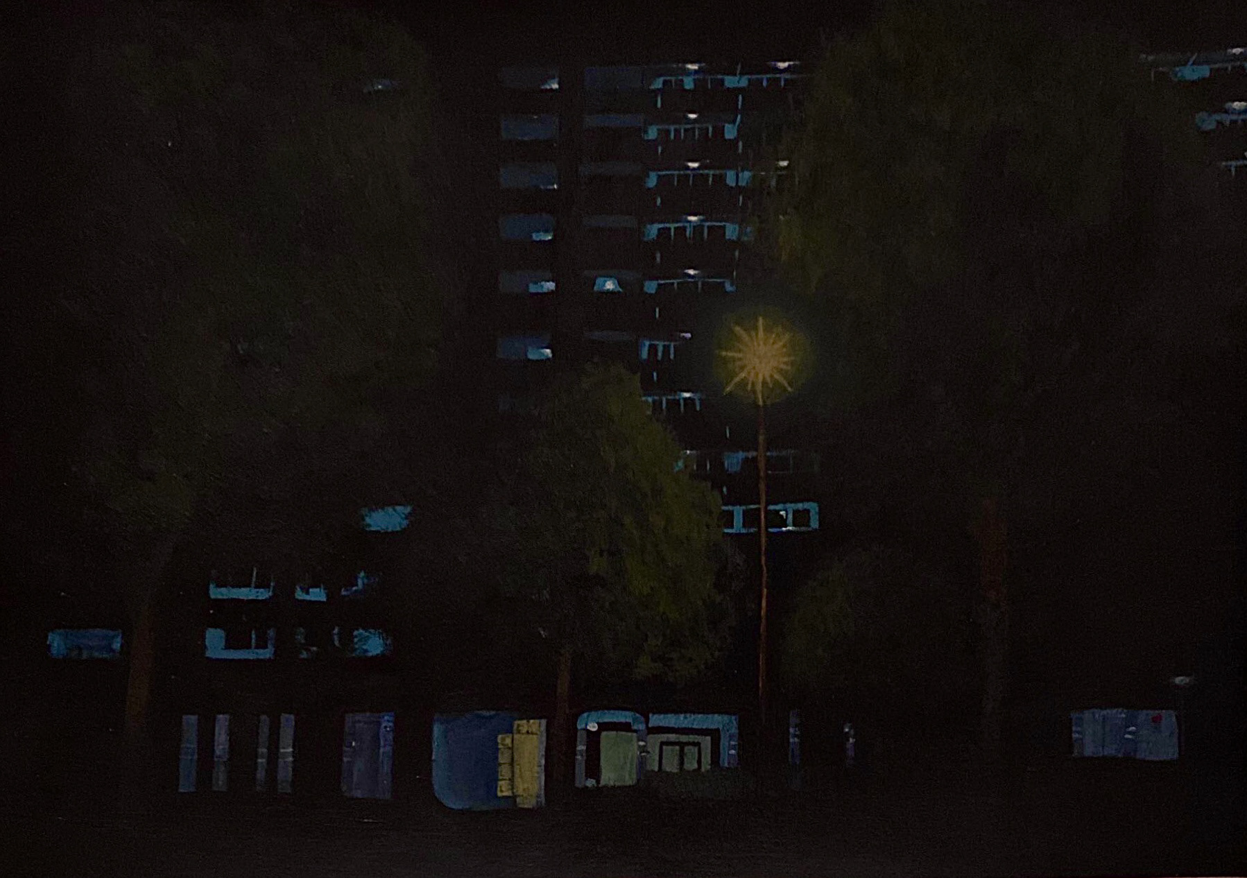 "Listen To The Cicadas" is an acrylic painting of an apartment complex near my house, one that I see almost daily, but rarely see at night. The work aimed to capture and elude to the presence of people despite none being seen, and aimed to capture how the world seems to be in a stand still when the night comes.