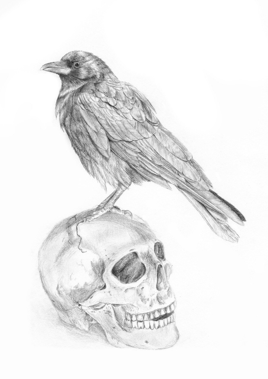 "Living Death" is a graphite piece that portrays a raven atop a skull. It contrasts the living and dead although both motifs signify death.