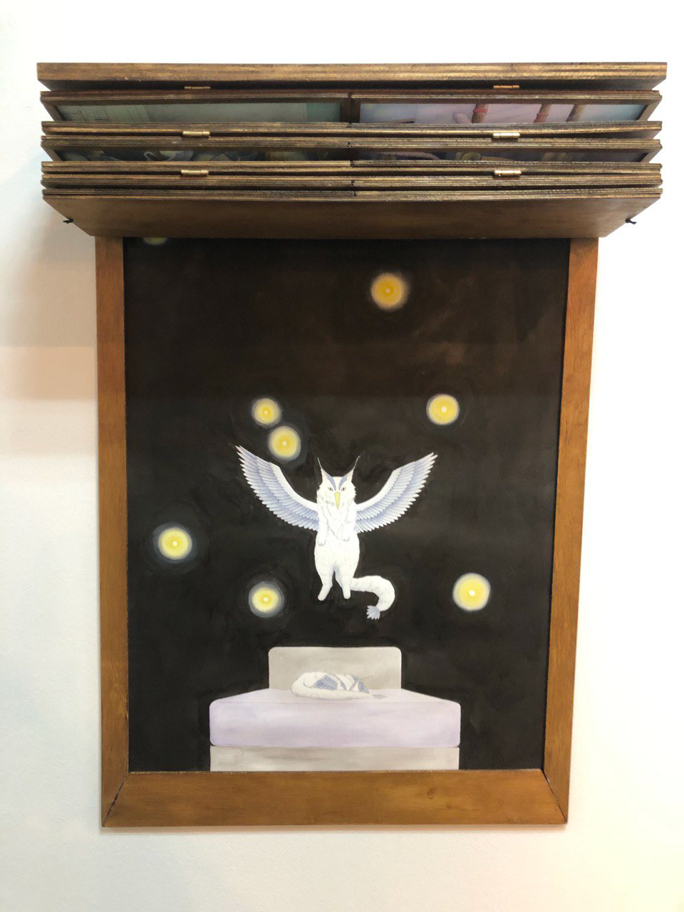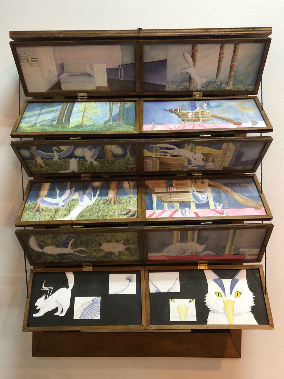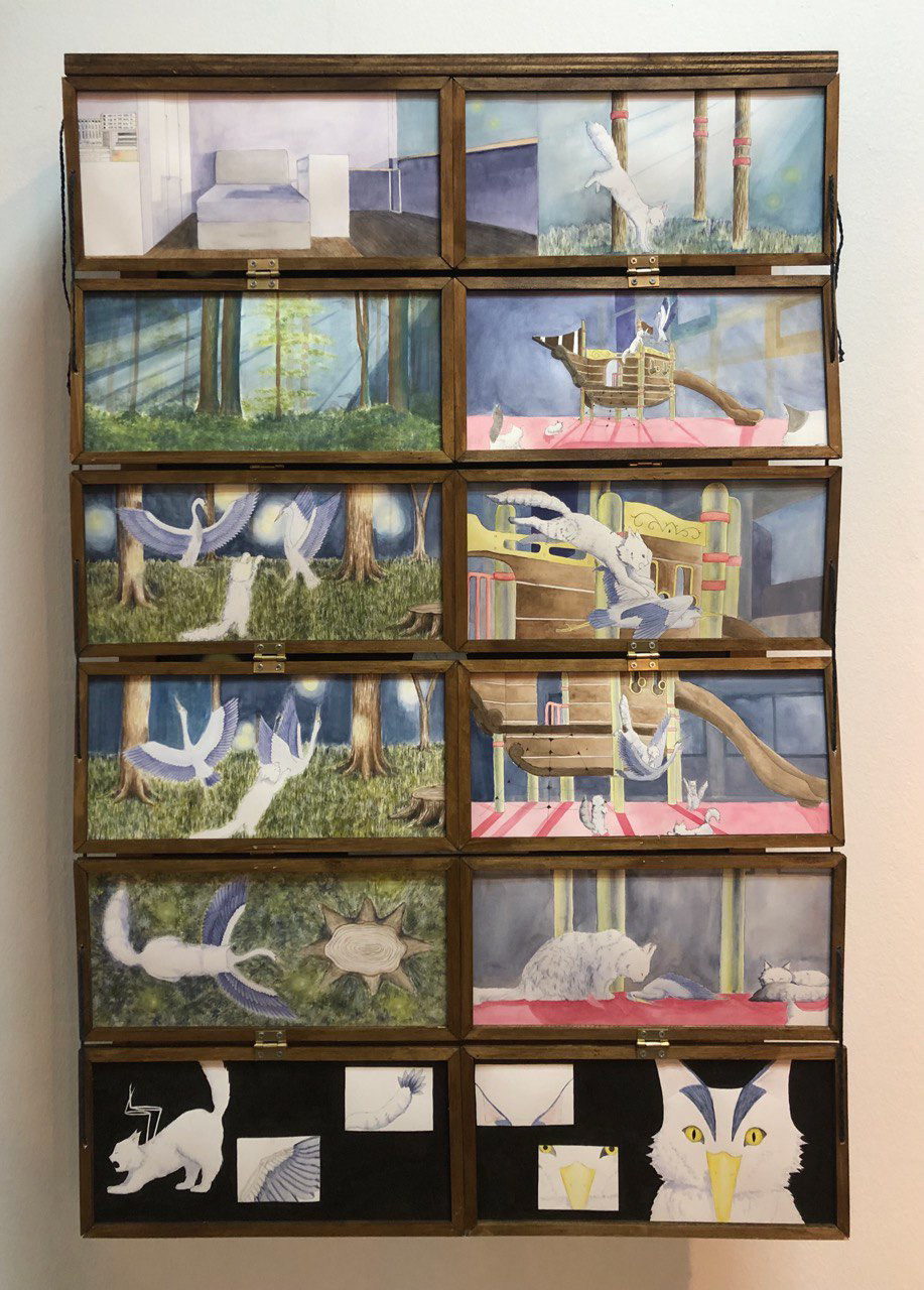 "Self-Thought" is a work that explores the process of myself and my thoughts that often happen at night. The scenes depict the cat (a metaphor of myself) fighting, killing, consuming, and eventually transforming to become one with the heron(a metaphor for my thoughts) and represents the cycle of self-acceptance to be able to be at peace with yourself. The work is done with watercolour, pen, and wood. The final hybrid is revealed when the levy is pulled, reminiscent of window blinds in my bedroom. The two columns have separate storylines in which in the forest, I have to come to terms on my own, whereas in the urban environment of the playground where I often meet my friends, I am able to overcome my thoughts with their help.