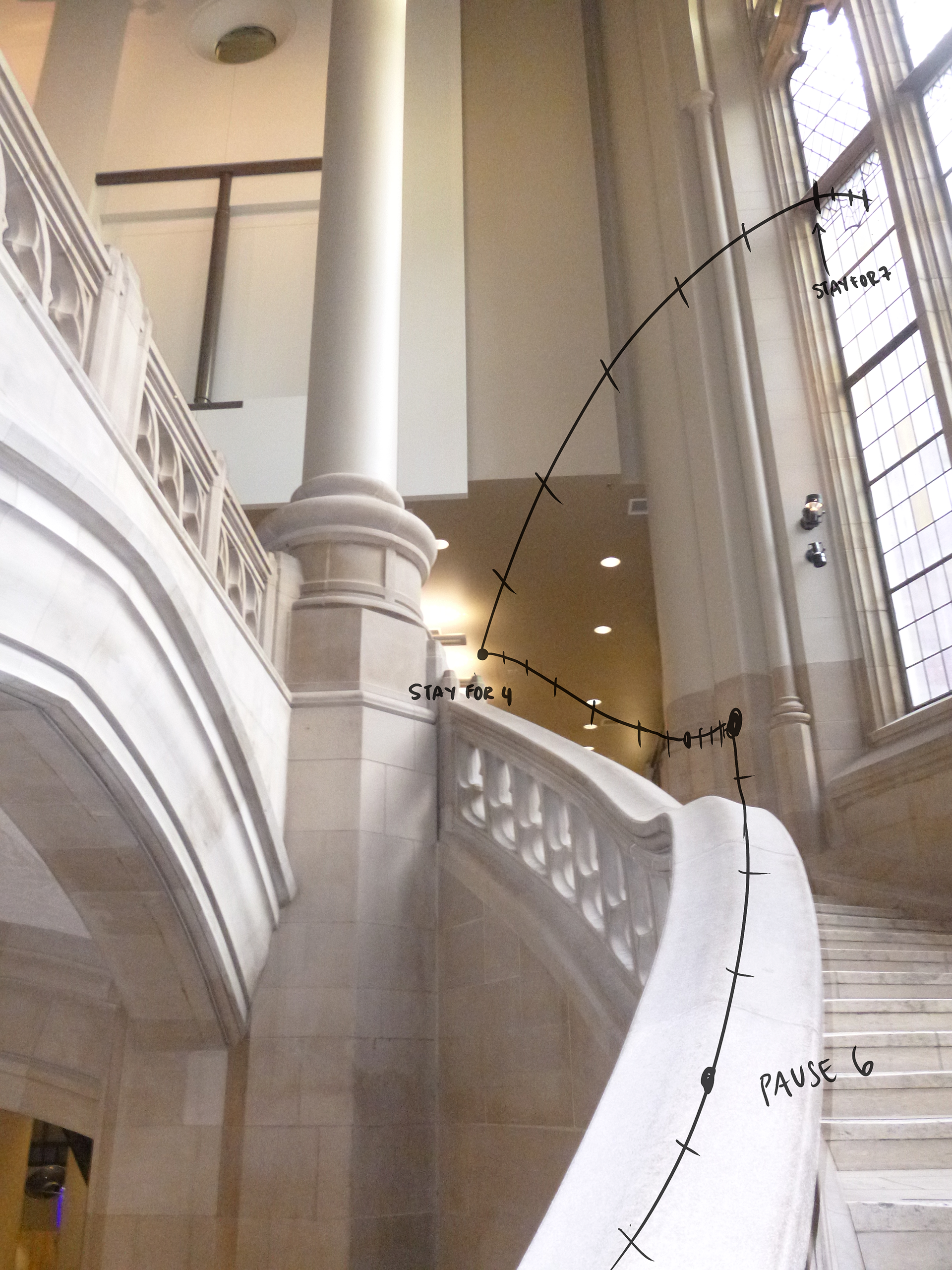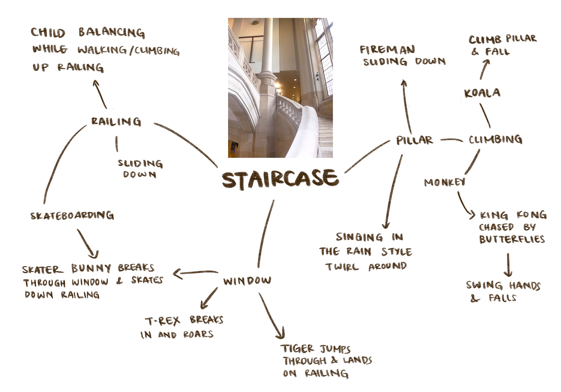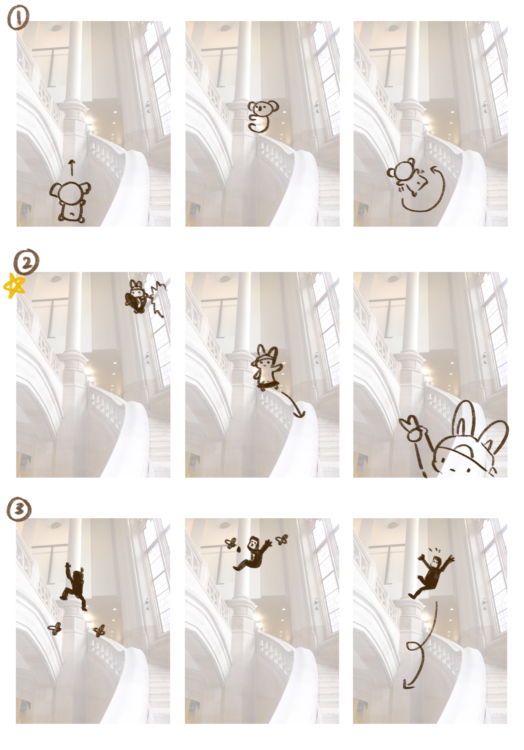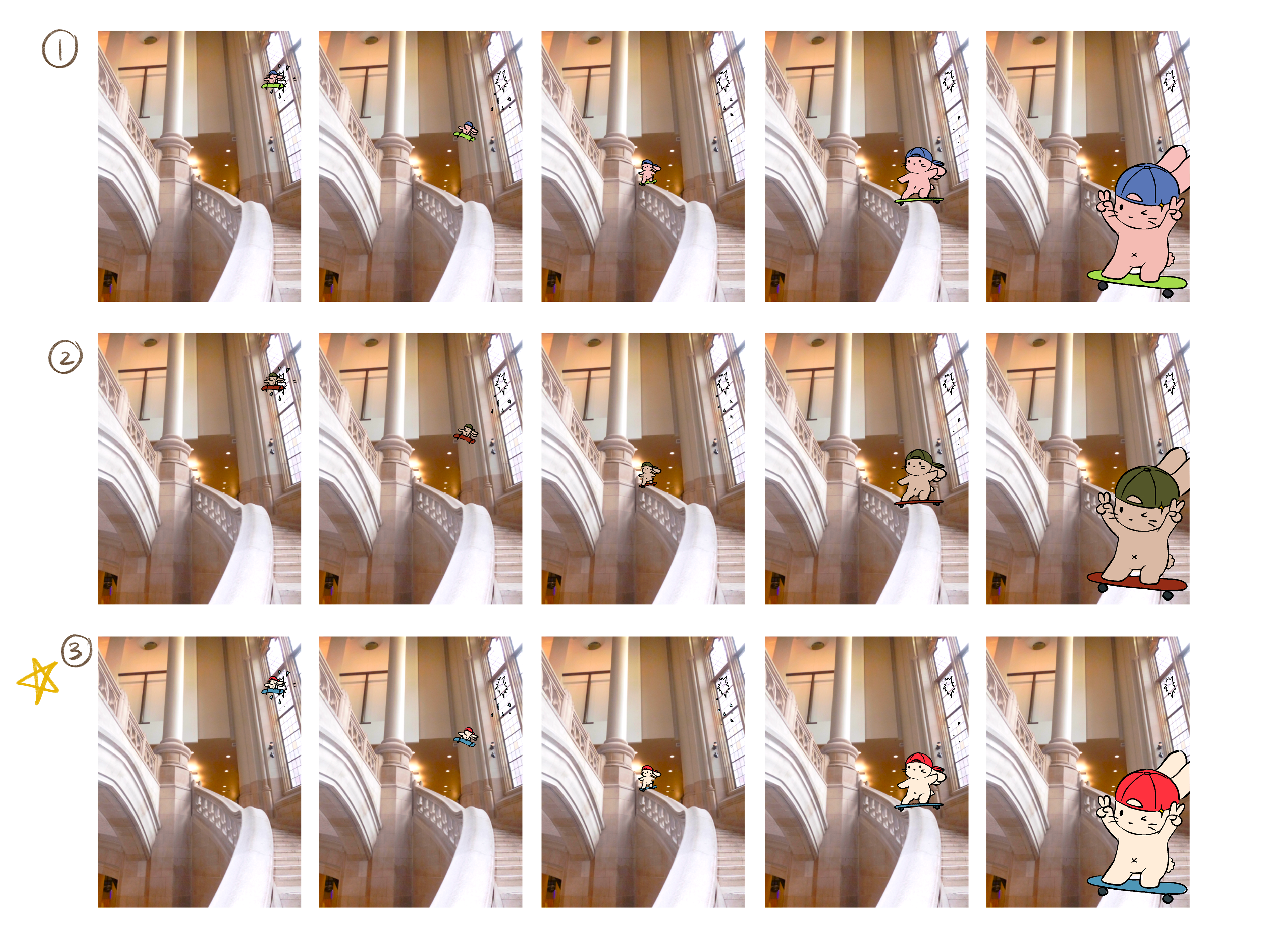 A bunny has broken through a window and is skating down the stair rail!