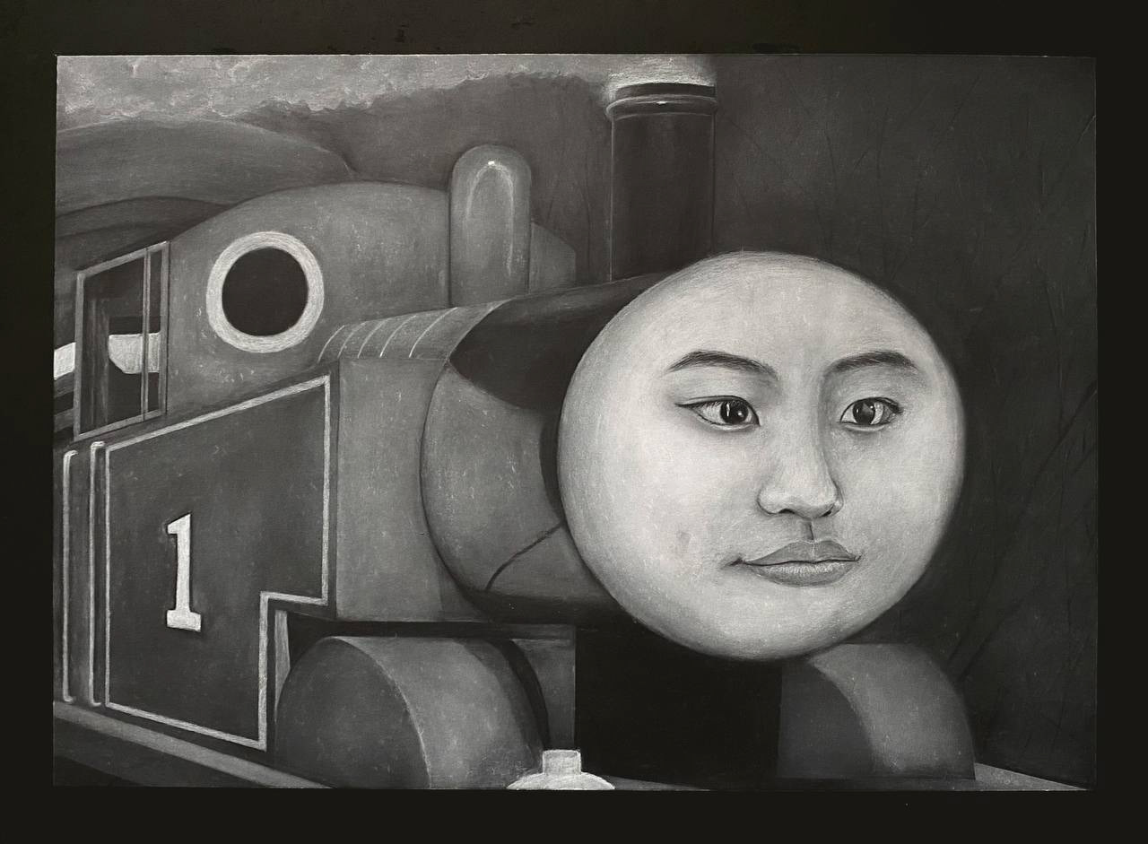 This white charcoal drawing on black paper was prompted by the assignment to merge our face with a character of our choice. While most chose human characters be it 3D or 2D, I decided on a character from my childhood, Thomas the Tank Engine.