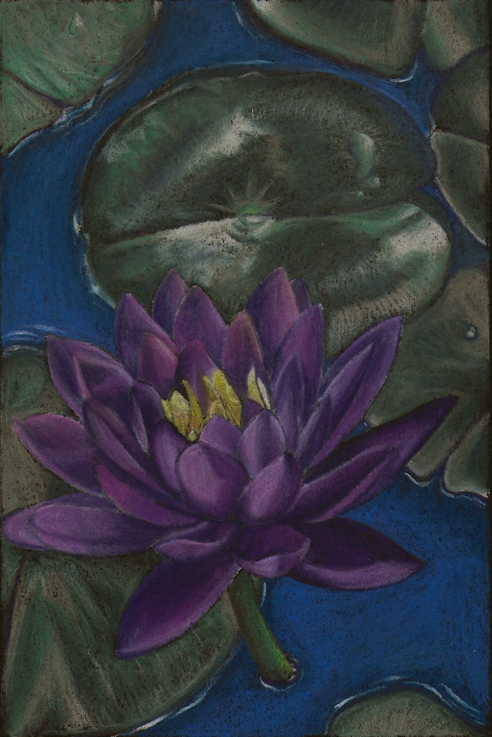 "Water Lily" is a realistic pastel drawing of a tropical water lily, a flower that, unlike most flowers, blooms at night.